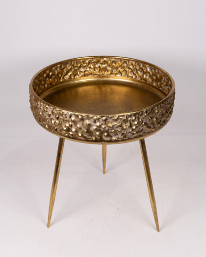 Hammered gold finish metal side table with round tray top and three legs. Stylish and functional for drinks or display.