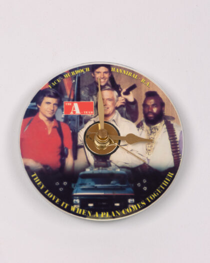 Upcycled from a CD, this fun wall clock is a unique item for fans of the 1980's TV show. The clock features the main characters, Hannibal, Face, B.A., and Murdoch. The quote 'They Love It When A Plan Comes Together' is featured around the edge. Untested.