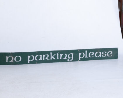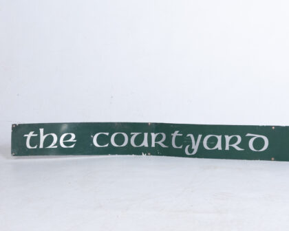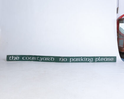 Metal sign, 'The Courtyard No Parking Please'. Green with white lettering. Good condition, pre-drilled holes for mounting.