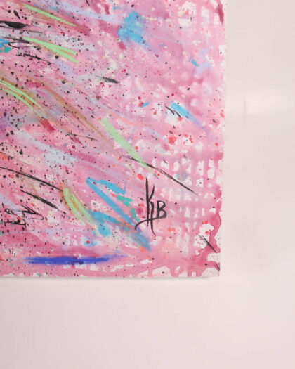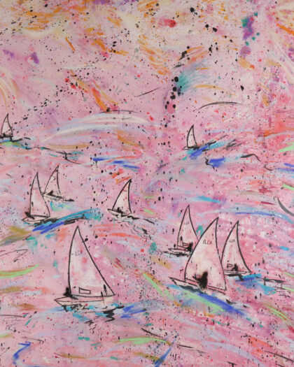 This is a brand new painting on canvas by the artist Kate Broderick. The painting features several sailing boats depicted in a sea of swirling pink tones, with accents of blue, white, and black adding depth and movement. The sail boats themselves are simply drawn in black. The canvas is stretched over a wooden frame. This artwork would be perfect for adding a touch of modern art to a living room or bedroom.