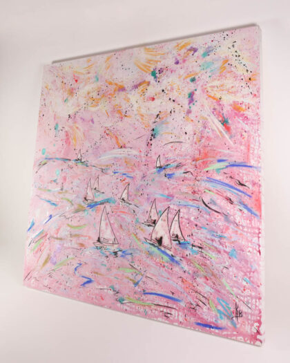 Brand new painting on canvas by artist Kate Broderick. Featuring several sail boats in pink tones. Unique modern art for your wall. Size is approx. height 100cm & width 100cm