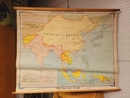 Map of the Far East in 1895. Features British India and the Chinese Empire. The bottom right corner has previously ripped off the wooden base but has been repaired. Made in 1969 for the Denoyer-Geppert Series.
