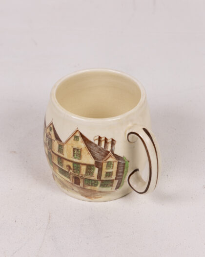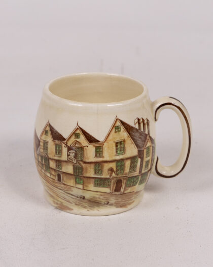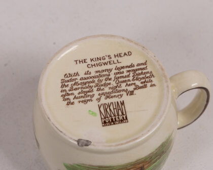 A Kirkham Pottery mug featuring a detailed image of The King's Head pub in Chigwell. The mug is made from ceramic and has a cream background with brown rim and handle detailing. The mug shows some signs of wear and crazing of the glaze which is consistent with its age. The image is of a period building, the King's Head, in Chigwell. It features a green hedge along the base of the building and the windows are also green. On the reverse is a painting of a landscape with a signpost. The base of the mug contains further historical information about the pub, and the Kirkham Pottery logo, indicating that it was Made in England.