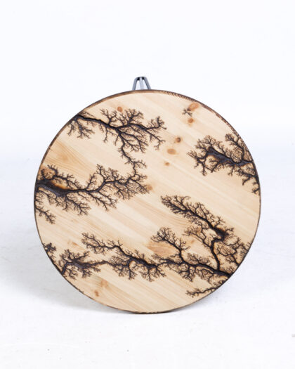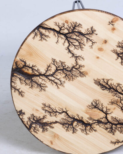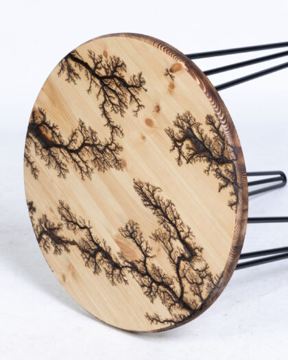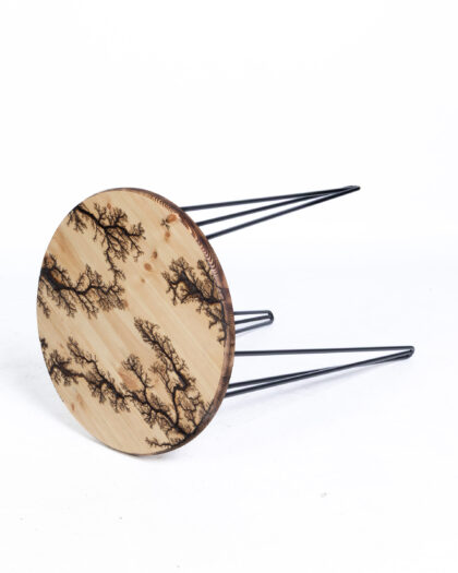 This handcrafted table brings natural character into your home. It is made by burning lightning-like patterns into the wood using high-voltage electricity, following the grain in unpredictable ways. Fitted with sleek steel hairpin legs and finished in a range of rich colours, this is made to stand out and spark curiosity.