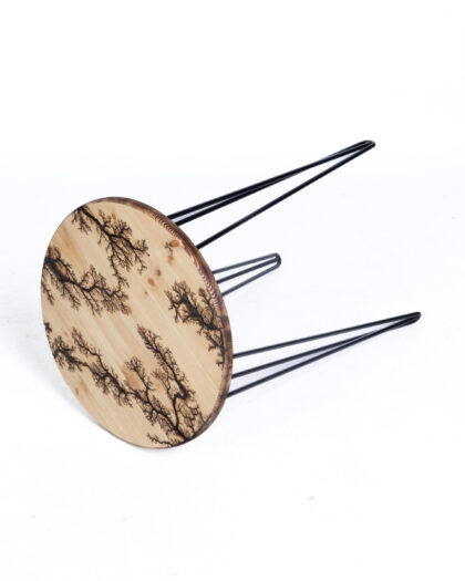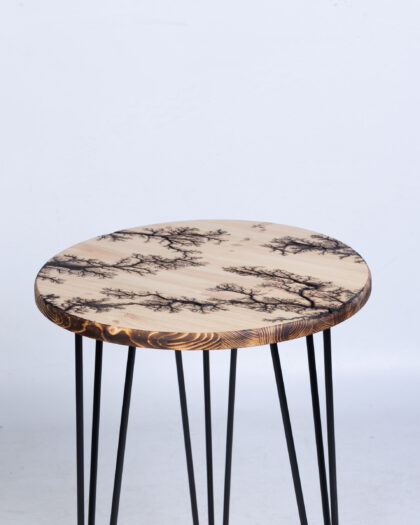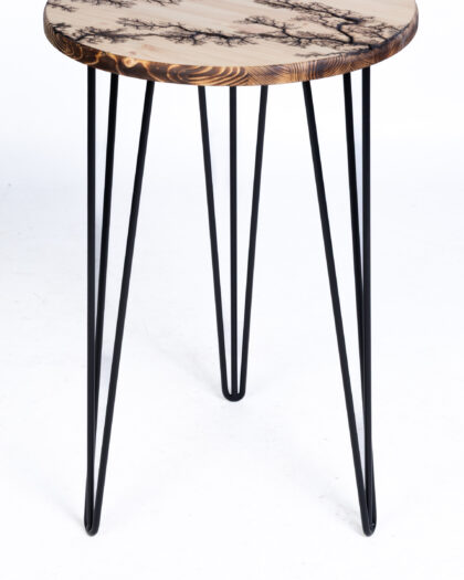 Tall wooden side table featuring a fractal lightning design on its round top, paired with sleek black hairpin legs. A unique statement piece!