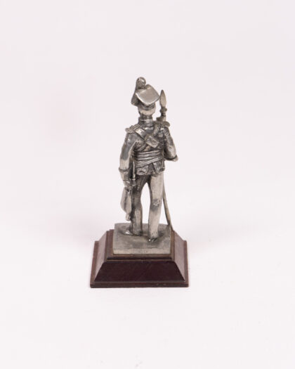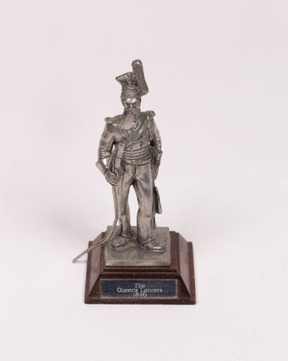 This is a vintage pewter figurine depicting a soldier of The Queen's Lancers 1846, meticulously detailed and mounted on a wooden base. The figurine is made of pewter, giving it a solid feel and a subdued silver-grey appearance. The base is made of wood, stained in a dark brown colour with an inscription on a silver label 'The Queen's Lancers 1846'. This figurine is in good vintage condition, with minor signs of wear commensurate with its age, adding to its character and authenticity. This is a great decorative piece for any military enthusiast.
