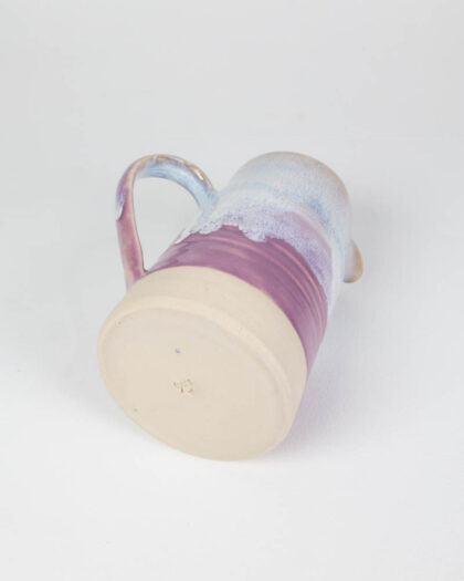 Handmade ceramic jug from The School House Pottery. Featuring purple, cream, and blue colourway. Complete with handle and pouring lip.