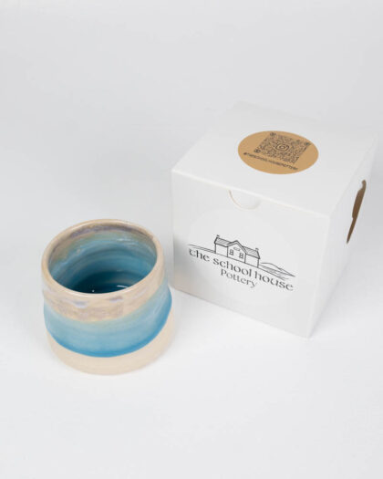 Handmade small flat white coffee mug from The School House Pottery. With a cream ceramic base and a graduated blue glaze finish.