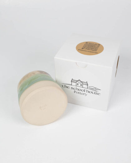 This is a brand new, handmade ceramic mug from The School House Pottery, showcasing a clean, contemporary design. The mug features a flat white ceramic base, complemented by a hand-applied glaze in soft green and cream tones. The glaze creates a unique, organic pattern, ensuring that each mug is slightly different. The mug's simple form and artisanal finish make it a charming addition to any kitchen or dining area. The smooth ceramic surface feels comfortable in hand and is perfect for enjoying hot beverages. This mug would look great in any home. Brand new condition.
