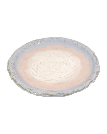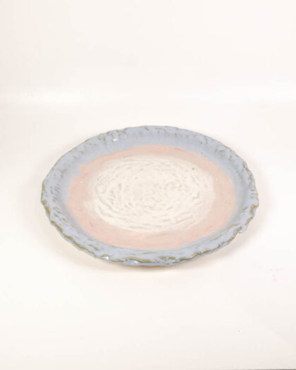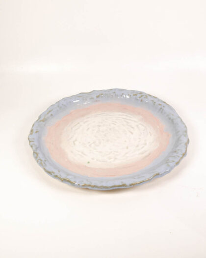 Handmade School House Pottery ceramic plate featuring a delicate pink and blue glaze. A beautiful piece of functional art.
