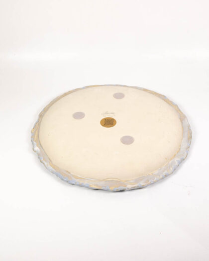 This is a brand new ceramic plate from The School House Pottery, showcasing a beautiful handmade design. The plate features a predominantly white centre, surrounded by a soft pink band, and finished with a light blue rim. The glaze has a subtle sheen, highlighting the texture of the ceramic. The back of the plate is plain ceramic with School House Pottery logo. This plate could be displayed on a wall, or used as a decorative piece on a table or shelf.