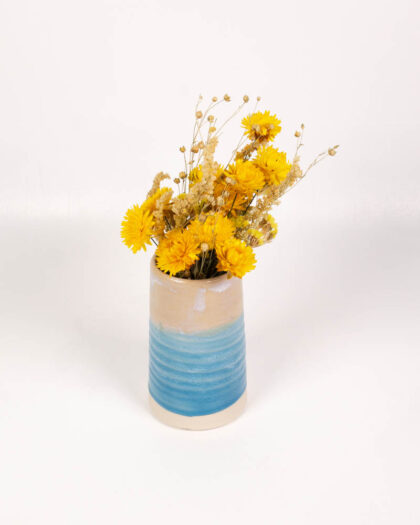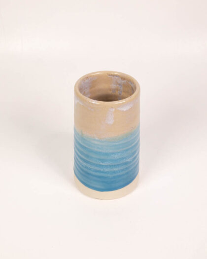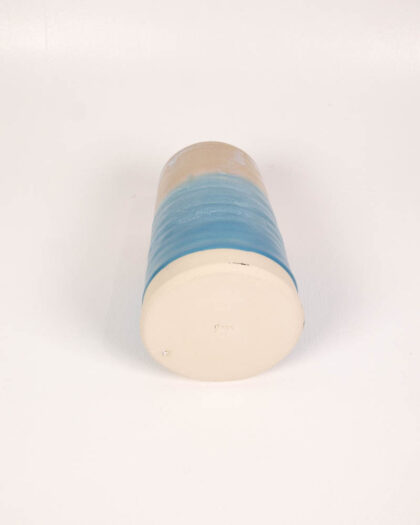 This is a brand new handmade ceramic vase from The School House Pottery. The vase features a cylindrical shape with a cream-colored upper portion that transitions into a vibrant blue glaze towards the base. The blue section is textured with horizontal bands, creating a visually appealing ribbed effect. The interior is glazed in a complementary cream colour, providing a smooth and water-resistant surface for holding flowers. Its design would make a charming display on a shelf, mantelpiece, or table.