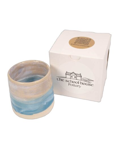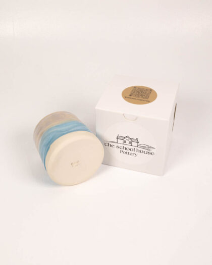 Handmade flat white mug from School House Pottery, crafted by Jane Mawson. Each mug is a unique piece of ceramic art. The mug features a smooth, flat white glaze at the base, transitioning into a beautiful blue glaze near the middle, and finished with a cream glaze at the top. This mug is a perfect addition to any kitchen or dining space, bringing a touch of artisanal charm to your daily coffee or tea routine.
