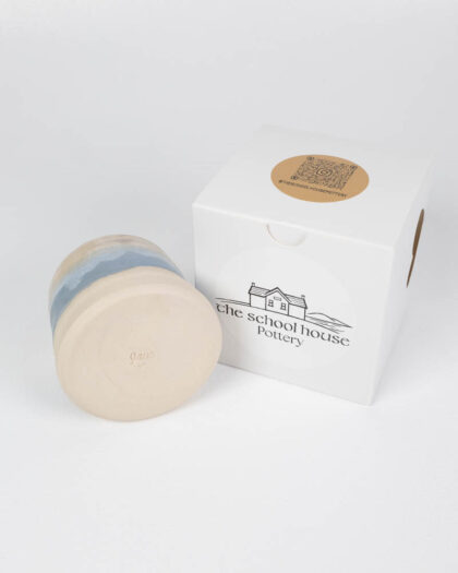 This is a brand new, handmade flat white coffee mug from The School House Pottery. It features a smooth, white ceramic body with a unique blue glaze design. The glaze has a layered appearance, creating a visually appealing effect. Perfect for adding a touch of handmade artistry to your morning coffee routine. Would display nicely in the kitchen.