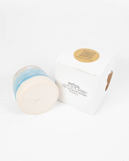 Handmade flat white coffee mug from The School House Pottery. Features a unique blue glaze design. Brand new.
