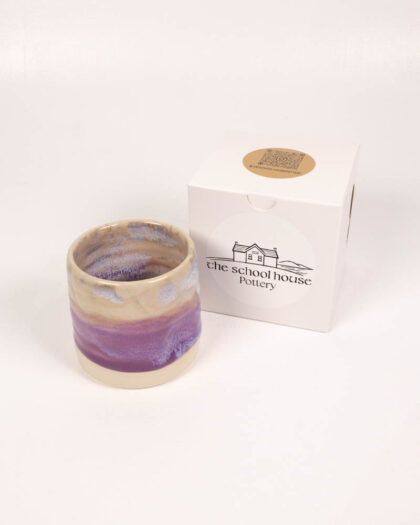 Handmade flat white ceramic mug from School House Pottery, crafted by Jane Mawson. It features a unique purple glaze that adds a touch of artistry to your daily coffee or tea routine. The mug's flat white base provides a clean and minimalist aesthetic, while the purple glaze creates a visually appealing contrast. Because each mug is handmade, every piece is slightly different and unique. Display it proudly in your kitchen or dining area, and enjoy the comfort and style it brings to your home.