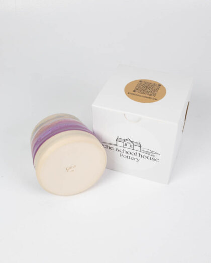This is a brand new, handmade ceramic mug from The School House Pottery. The mug features a cream exterior with a unique purple glaze that wraps around the middle section. The glaze has a subtle shimmer, adding a touch of elegance to the rustic handmade design. The bottom of the mug bears the maker's mark. This mug is perfect for enjoying your favourite hot beverage and would look lovely in the kitchen.