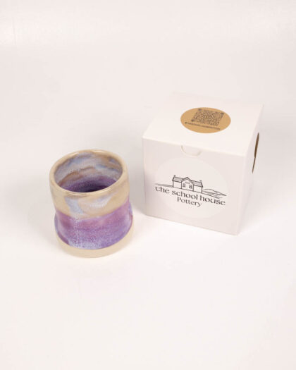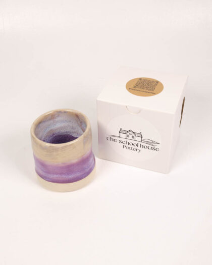 Handmade School House Pottery mug. Small white ceramic mug with a unique purple glazed finish. Each mug is subtly different.