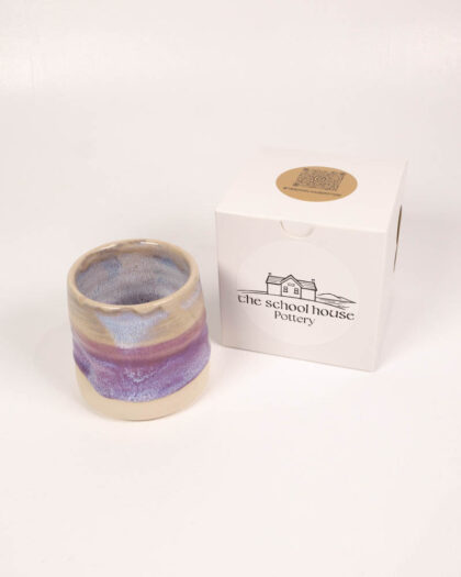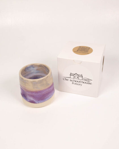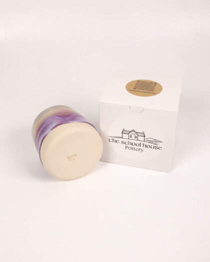 This flat white mug made by Jane Mawson of School House Pottery. Each mug is handmade, resulting in a unique piece with slight variations in shape and glaze. The mug features a ceramic glaze with a blend of cream, white, and purple tones, creating a soft and visually appealing design. The handmade nature of the mug adds to its charm and character. It would be ideal for daily use or display on a shelf.