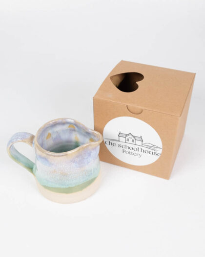 This is a brand new, small handmade jug from The School House Pottery. The jug has a simple, classic shape with a curved handle and a slightly flared lip for easy pouring. The ceramic body is glazed in a soft, graduated blend of blue, green, and cream, creating a subtle, soothing aesthetic. The base of the jug is unglazed, showing the natural ceramic material. Due to the handmade nature, each jug has slight variations in glaze and finish. It would be a charming addition to a kitchen, dining room, or breakfast table, perfect for serving cream, milk, or sauces.
