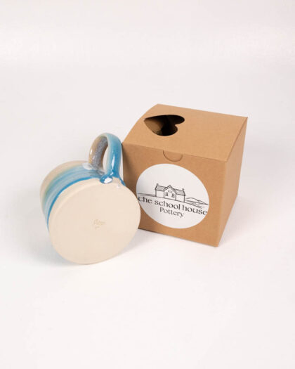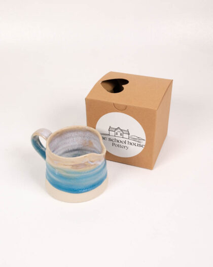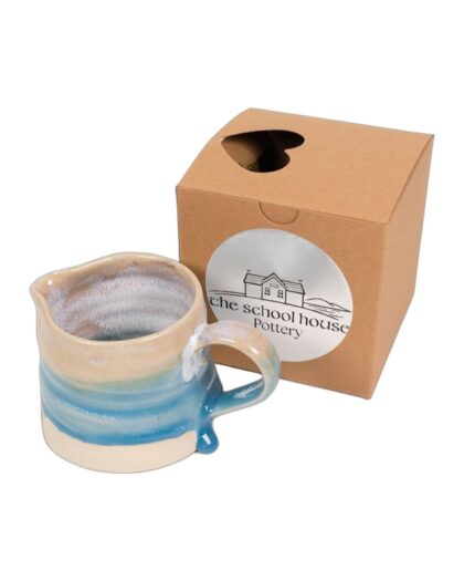 This is a brand new, handmade ceramic jug from The School House Pottery. It features a beautiful blue glaze which fades into a cream/white at the base. The top of the jug features a white/beige glaze. The handle is blue and has a unique style. This item would look great in any room in the home.