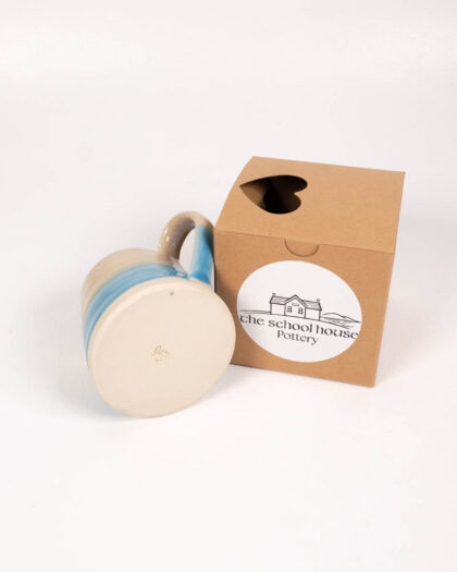 This is a brand new, hand made ceramic jug by The School House Pottery. The small jug is a creamy colour with a band of blue around the base. It would be perfect for serving cream, milk or gravy at the table.