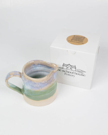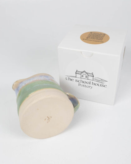 A new handmade ceramic jug by The School House Pottery. Features a cream, green, and blue glaze. Perfect for use in the kitchen or as a decorative item.