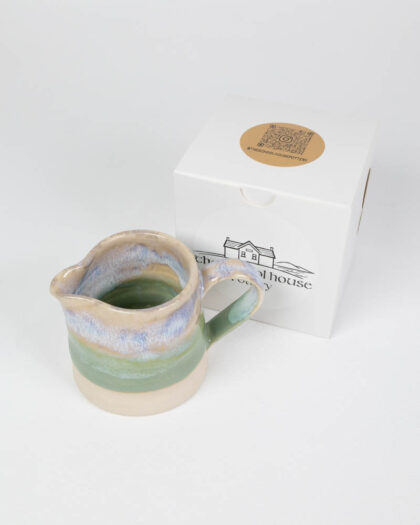 This is a brand new, handmade ceramic jug from The School House Pottery. The jug has a classic shape with a small handle and a charming, rustic design. The colours are a blend of cream, green, and blue glaze with the colours blending together seamlessly. This jug is perfect for serving milk or cream, or as a decorative piece in the kitchen. It would also make a lovely addition to a breakfast table setting. The base has been hand signed. The jug is in excellent condition and ready for use.