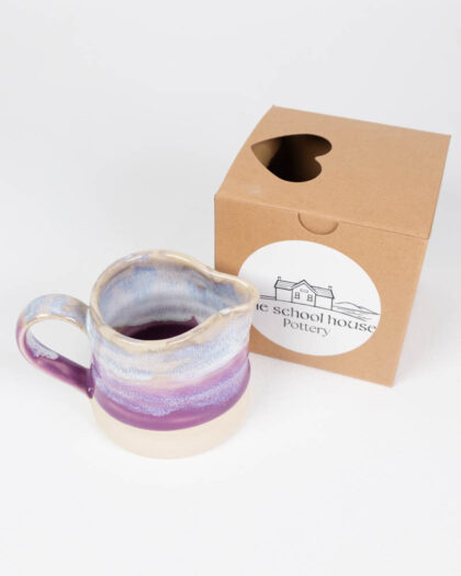 This is a brand new, handmade pottery jug created by The School House Pottery. The jug features a distinctive design with a purple glaze that transitions into cream and blue near the top. The jug is functional and perfect for serving liquids. It has a sturdy handle and a unique shape, making it an attractive piece of pottery. This handmade jug would be a beautiful addition to a kitchen or dining room, adding a touch of rustic charm to any setting. It is ideal for those who appreciate artisan crafts and unique homeware.