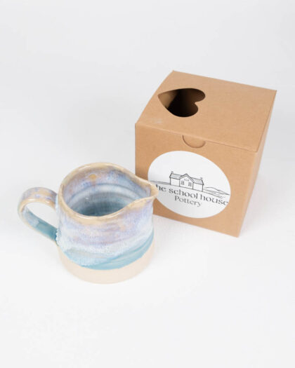 This is a brand new, handmade pottery jug from The School House Pottery. It features a unique blue and white glaze, giving it a lovely rustic yet modern look. The jug has a classic shape with a comfortable handle, making it perfect for pouring milk, cream, or sauces. Its neutral colour palette will complement any décor. The School House Pottery stamp is on the base. This jug is ideal for everyday use or for displaying as a decorative piece in your kitchen or dining room.