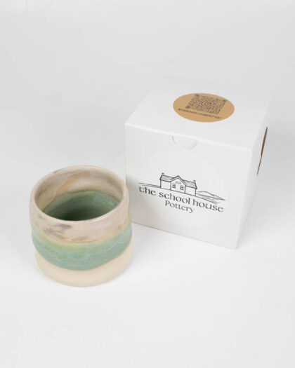 This is a brand new handmade ceramic mug by The School House Pottery. The mug is flat white in colour with a hand painted section of green and cream at the top. The mug is ideal for a cup of tea or coffee and perfect for use in any home. A great gift idea.