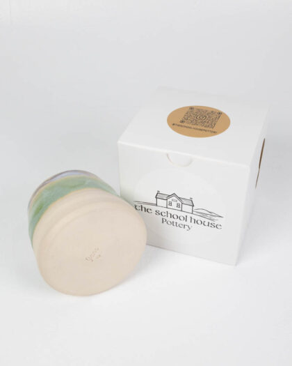 This is a brand new handmade ceramic mug from The School House Pottery. The mug features a flat white base and a unique green glaze that blends into a cream colour near the top. The mug has a smooth, tactile surface due to the pottery process. This mug would be a nice addition to any kitchen and can be used to enjoy your favourite hot beverages.