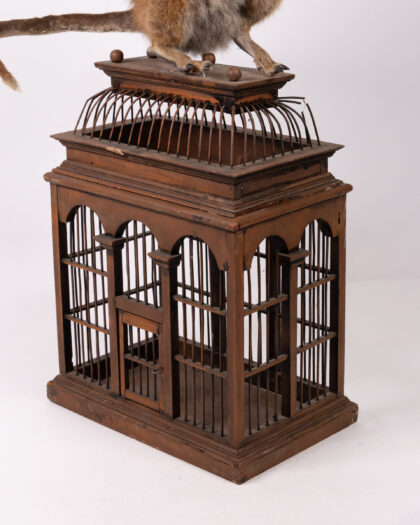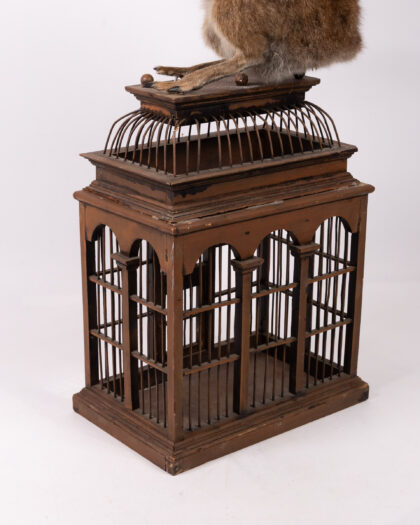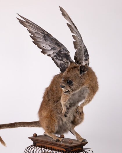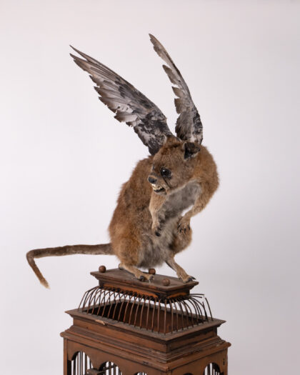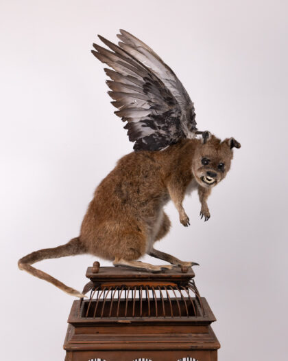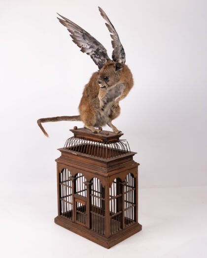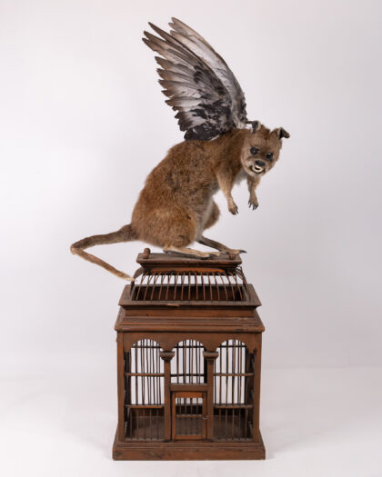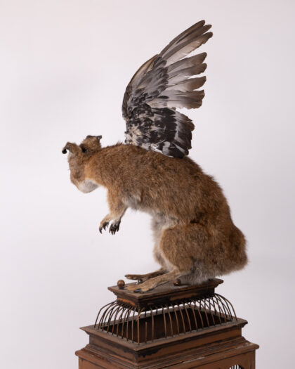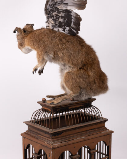 Intriguing taxidermy hybrid sculpture on birdcage. Kangaroo body, dog head, bird wings. Unique art piece!