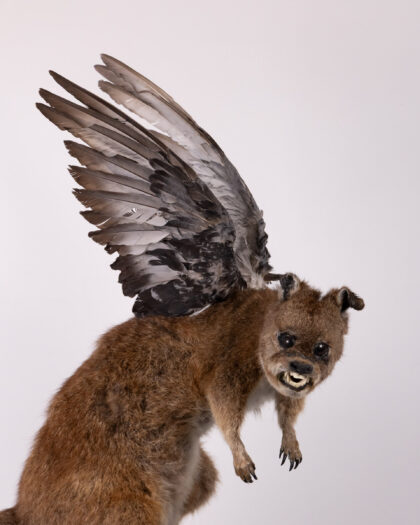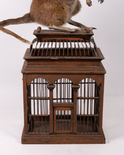 A unique taxidermy art sculpture featuring a red-neck wallaby body (Notamacropus rufogriseus), a vervet monkey's skull for the head with visible teeth (Chlorocebus pygerythrus), and pigeon wings (columba livia domestica). The creature is mounted atop a vintage wooden birdcage with an aged, dark finish. This unusual and intriguing piece is sure to be a conversation starter and a unique addition to any collection.