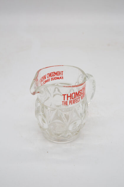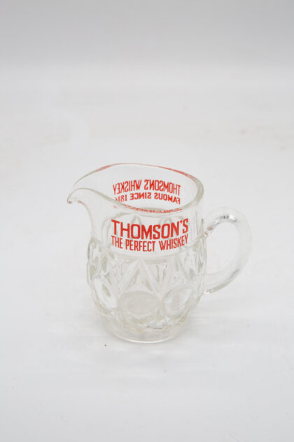 A glass water jug for Thomson's Whiskey.