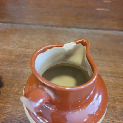 The handle is broken and there is a chip on the spout.