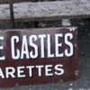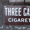 “Three Castles” Cigarettes advertising sign. Deep brown enamel on metal with white lettering. Perfect for a vintage collection.
