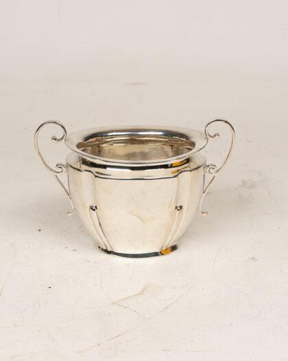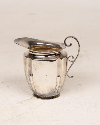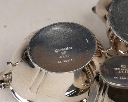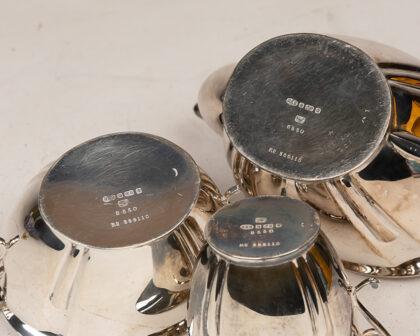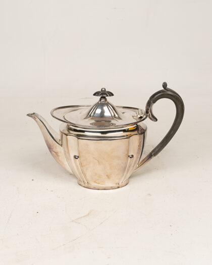 This is a vintage R&B Ltd silver plated tea set. It includes a teapot with a black handle, a sugar bowl, and a milk jug. All pieces feature an Art Deco style with vertical panel detailing. Markings on the bottom of each piece say R&B LTD. The items are in good condition with some signs of wear consistent with age. Perfect for collectors of vintage silverware or for adding a touch of elegance to your tea service.