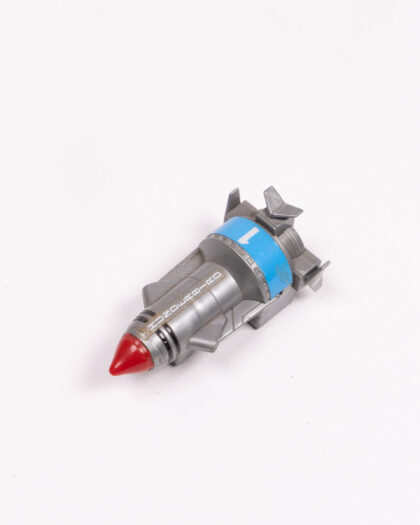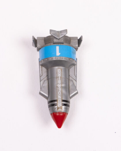 A vintage Thunderbirds toy rocket, made of plastic with a grey body, red nose cone and blue detailing. This piece is from 1992, made by Bandai in China. Features the number 1 on the body. The rocket has wheels and can be rolled. It displays some signs of age and use. A fun toy for any fan of the classic Thunderbirds TV show.