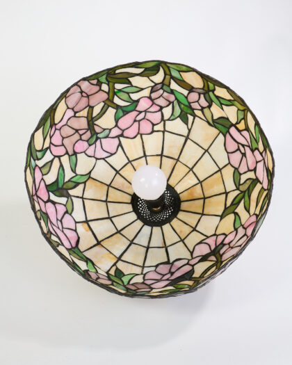 Tiffany style stained glass ceiling light with pink and green floral design. Cream background glass. Good condition.