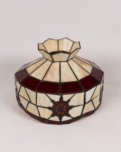 Vintage Tiffany-style stained glass lampshade, cream & red segments with dark trim, nautical knot and star patterns. In very good condition.