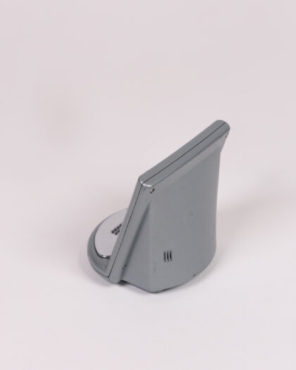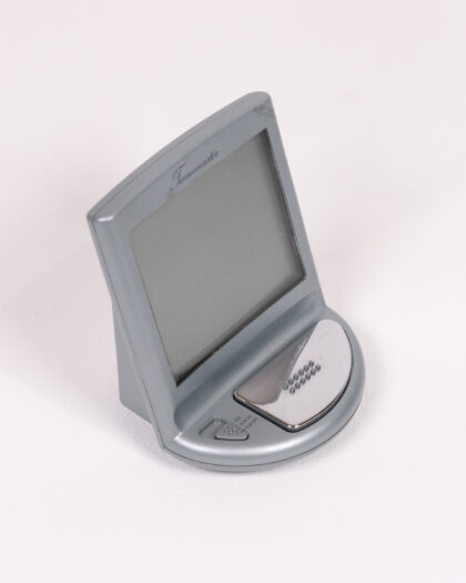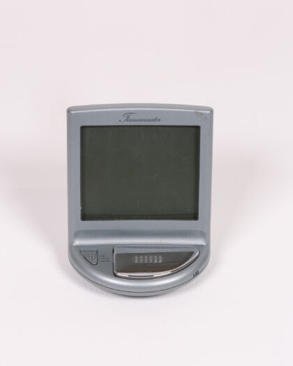 This is a Timemaster electronic alarm clock. The casing is primarily grey plastic. The screen is black. There are several buttons and raised detail at the base. The alarm clock has a stand to allow it to be stood up. It has a modern design. Item is untested.