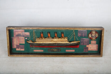 An interesting shadowbox that tells the story of the Titanic RMS White Star Line including a 3D model of the boat alongside reproduction letters and pictures.