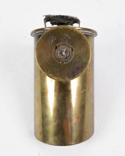 This is a vintage Trench art miniature brass coal shuttle. It is made from two military shells 70mm and a 40mm It features a cylindrical body with a copper-toned handle on top and a spout at the front for pouring coal. A decorative Canadian crest is attached to the front of the shuttle, adding a touch of elegance to this utilitarian object. The brass exhibits a warm, aged patina, with some darker areas showing the effects of time and use. The base has a simple, raised design. The shuttle could be displayed as a decorative antique item.