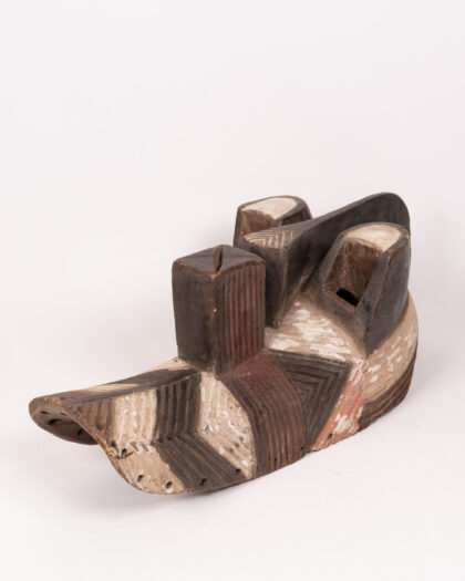 Striking tribal-style wooden mask. They are Kifwebe masks from the Songwe tribe, they were worn only by male initiates of a secret society and used during night dances and most important lunar ceremonies or during inauguration or the death of a chief. Geometric patterns in brown, white, and black. Perfect for adding an eclectic touch to any room.
