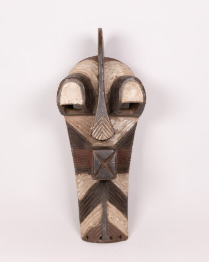This is a decorative wooden mask with tribal-style geometric patterns. They are Kifwebe masks from the Songwe tribe, they were worn only by male initiates of a secret society and used during night dances and most important lunar ceremonies or during inauguration or the death of a chief. The mask features an elongated face with protruding tubular eyes, a flat nose, and a protruding cross-shaped element at the mouth. The colors are primarily brown and white, with some black outlining. The mask has a weathered appearance and carved details, which add to its character. It is made of wood and has a flat back, allowing it to be hung on a wall.