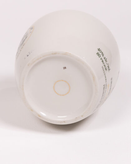 This is a ceramic Tullamore Dew Whiskey Jug. The jug is mainly white with a dark green top and handle. There is an image of a building on the side. The jug is in great condition, with no visible chips or cracks. This ceramic jug would look great as part of a collection or as a decorative item in a home bar.
