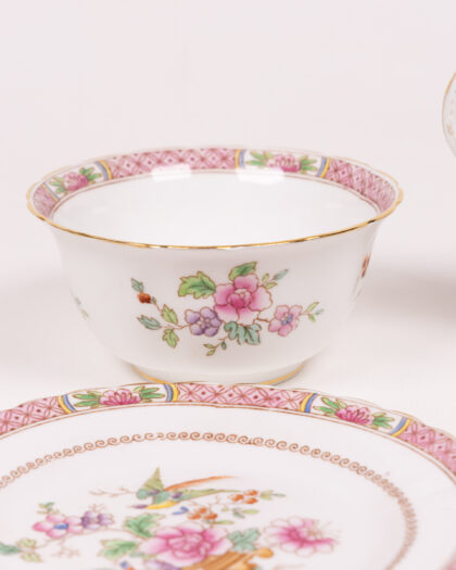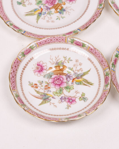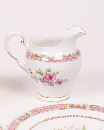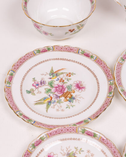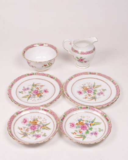 This is a beautiful Tuscan Fine English Bone China tea set. The set includes four saucers, a sugar bowl, and a milk jug, all decorated with a delicate floral and bird pattern in shades of pink, purple, green, and blue, with gold trim. The set is in good condition, but may show signs of gentle use commensurate with its age. A delightful addition to any collection or as a standalone display piece.
