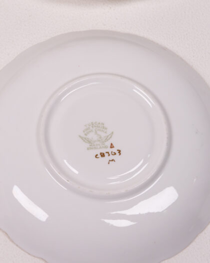 Elegant Tuscan Fine English Bone China tea set, featuring floral & bird motif. Includes 4 saucers, sugar bowl & creamer. Perfect for display!