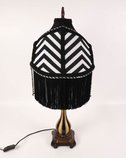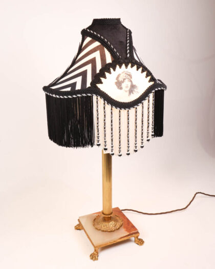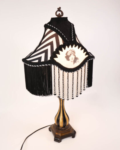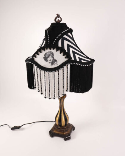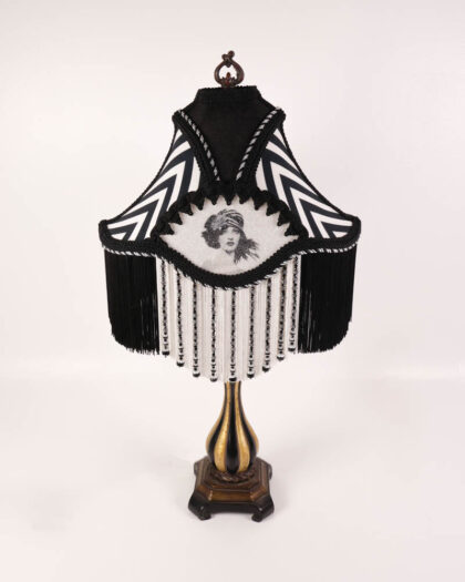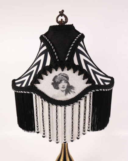 This lampshade is meticulously crafted with layers of black and white velvet velour over silk lining and trimmed with black gimp braid, black and white fringe tassels, and black and silver Czech beads to complement the black and silver insertion cord. For the "sugar shade" panel, I've meticulously applied a vintage-style picture featuring a lady wearing a black and white hat, perfectly matching the aesthetic of the rest of the shade.